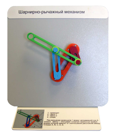 Модель действующего шарнирно-рычажного механизма предназначена для демонстрации преобразования вращательного движения кривошипа вокруг неподвижной оси в сложную замкнутую кривую исполнительного рычага.
