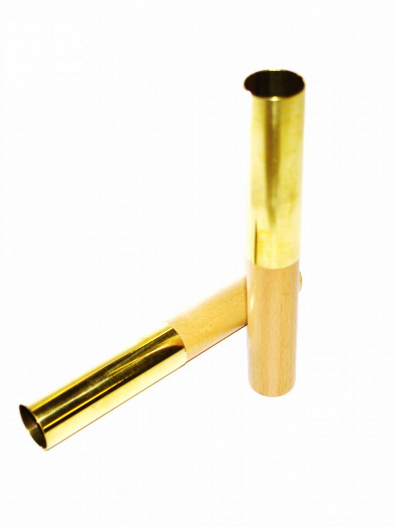 Комплект состоит из пары цилиндров. Одна половина каждого из цилиндров выполнена из дерева, а другая - из латуни.