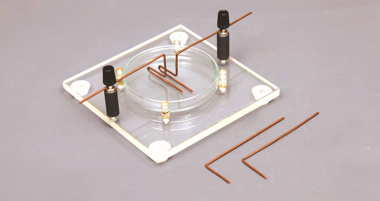 На прозрачной пластине расположена чашка Петри диаметром 90 мм и два контактных гнезда на изолированных основаниях с зажимами диаметром 4 мм. В комплект входят два точечных и два Т-образных электрода. Пластину размещают на столике оверхед-проектора или в поле зрения документ-камеры. В чашку Петри наливают касторовое масло, в котором взвешены частички манной крупы. Резкость графического проектора настраивается таким образом, чтобы крупинки были видны на экране. Электроды подключают к источнику высокого напряжения с помощью соединительных проводов (в комплект не входят). На экране демонстрируется как крупинки выстраиваются вдоль силовых линий электрического поля, возникшего между электродами.