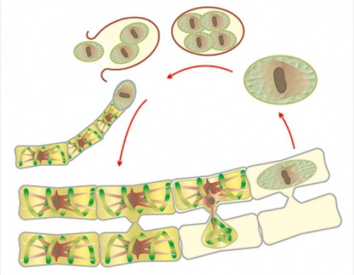 Многоклеточная водоросль спирогира так же как и одноклеточные водоросли размножается зиготами, возникающими после конъюгации. Конъюгация происходит между клетками двух различных нитей, как показано на схеме, и сопровождается слиянием содержимого клеток и слиянием из ядер. Также спирогира может размножаться обрывками нитей.