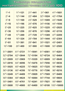 Таблица "Таблица квадратов натуральных чисел от 1 до 100" (100х140 сантиметров, винил)