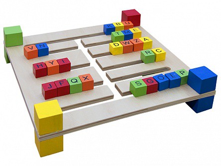 Представляет собой деревянную основу на цветных кубических опорах с прорезями для перемещения букв. Буквы размещены в прорезях на цветных кубиках, соединенных между собой попарно деревянной шпилькой.