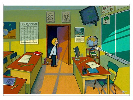 Плакат представляет собой настенное гибкое магнитное полотно с яркой иллюстрацией классного кабинета и комплектом магнитных карточек.