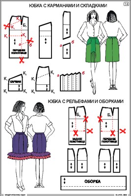 Наглядно-методические материалы комплекта иллюстрируют способы моделирования юбок различных фасонов: клиньевой юбки, прямой юбки, юбки «годе», юбок с кокеткой, рельефами, оборками и т.д.