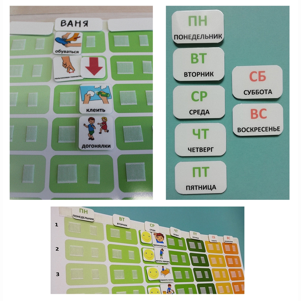 В верхней строке располагаются карточки "дни недели", вся панель используется как визуальное расписание на неделю для одного ребенка или для группы детей вместе. В каждой ячейке имеется 2 липучки, что позволяет отмечать успешно выполненные действия. Жетоны можно приобрести отдельно.