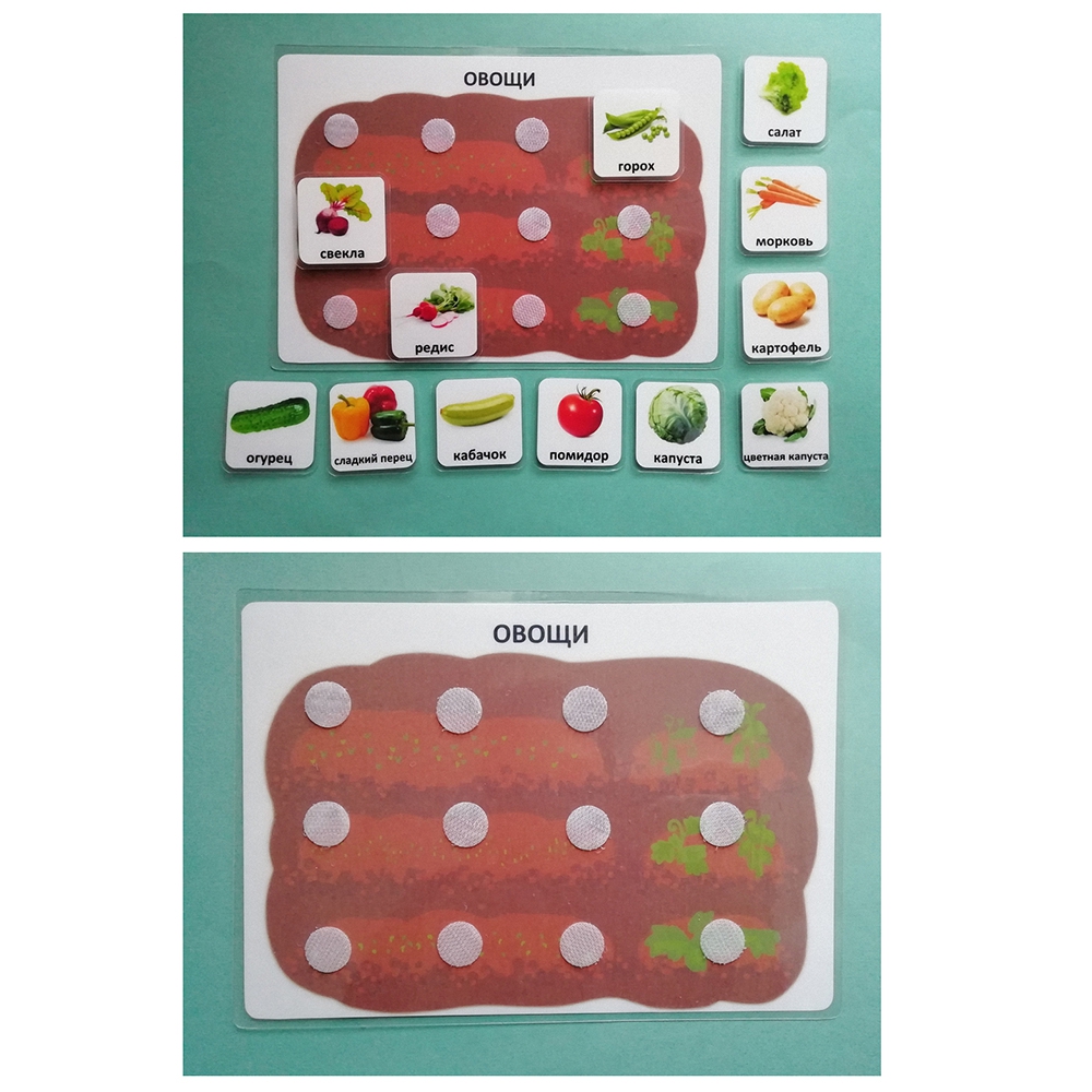 Наборы карточек "Овощи" (12 шт.) и "Фрукты" (12 шт.) размером 4 на 4 см входят в комплект.