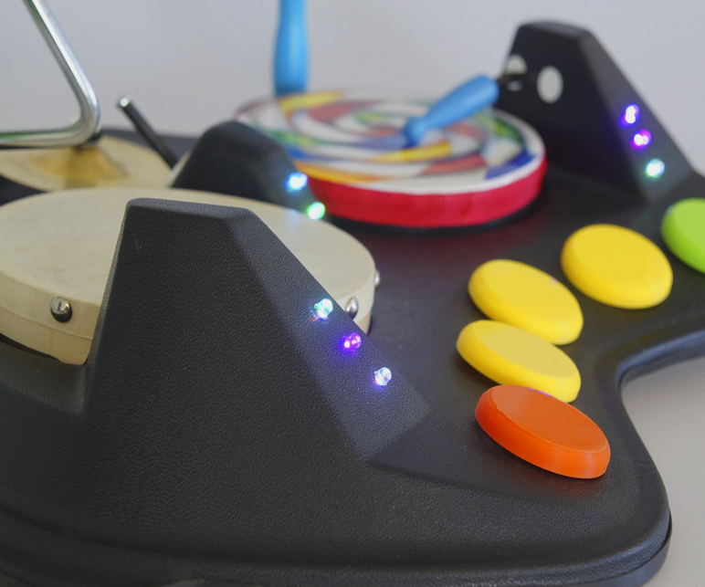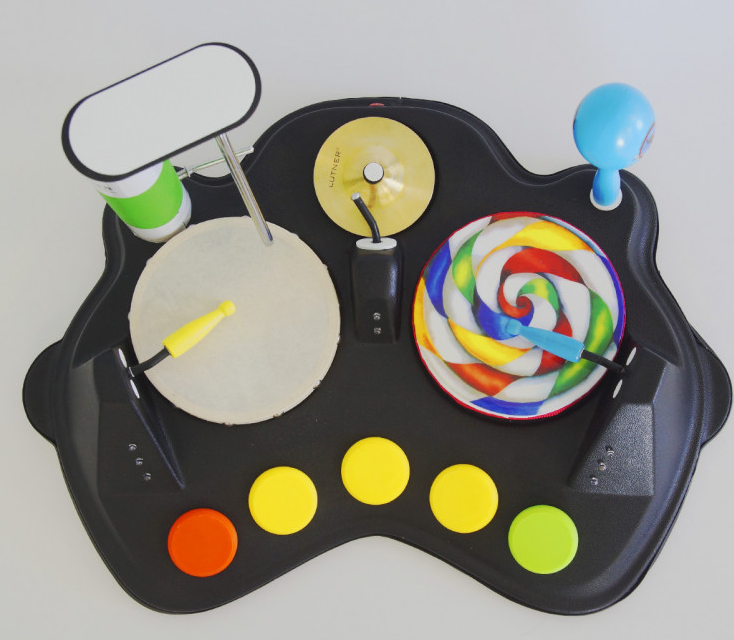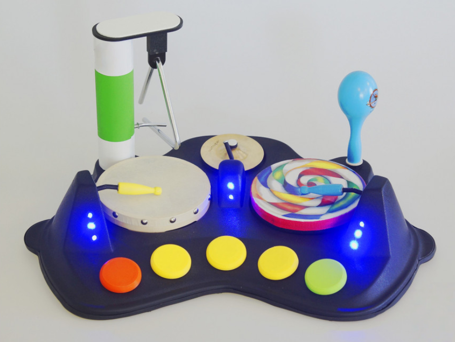 Барабанная установка. Это устройство для проведения музыкальной терапии. Состоит из 5 ударных музыкальных инструментов. Для того, чтобы начать играть на бубне, треугольнике, барабане, кимвале, маракасах, задействуется кнопка с изображением инструментов. При этом установка подсвечивается изнутри многоцветными светодиодами.  Возможность одновременно играть на всех инструментах. Питание, батарейки, в комплекте.