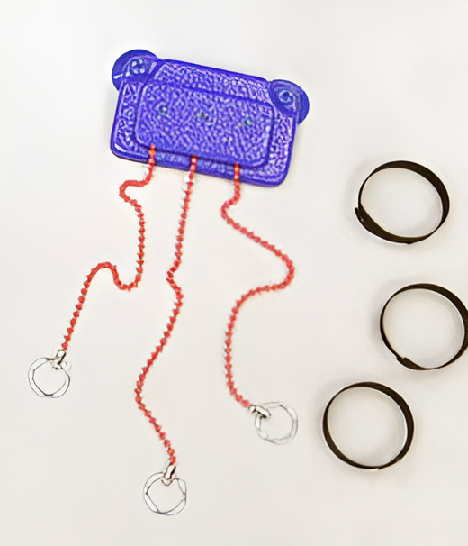 Держатель для различных предметов на присосках, состоящий из трех цепочек с кольцами для закрепления предметов на концах. Держатель препятствует падению на пол таких предметов как игрушки, посуда, письменные принадлежности и т.д. Две сильные присоски позволяют держателю не соскальзывать и оставаться на месте на подносе, кресле, кухонном или письменном столе, на кровати.