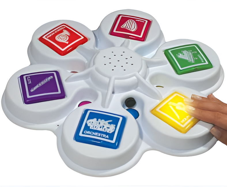 На каждой цветной кнопке нарисован и подписан один из пяти музыкальных инструментов: