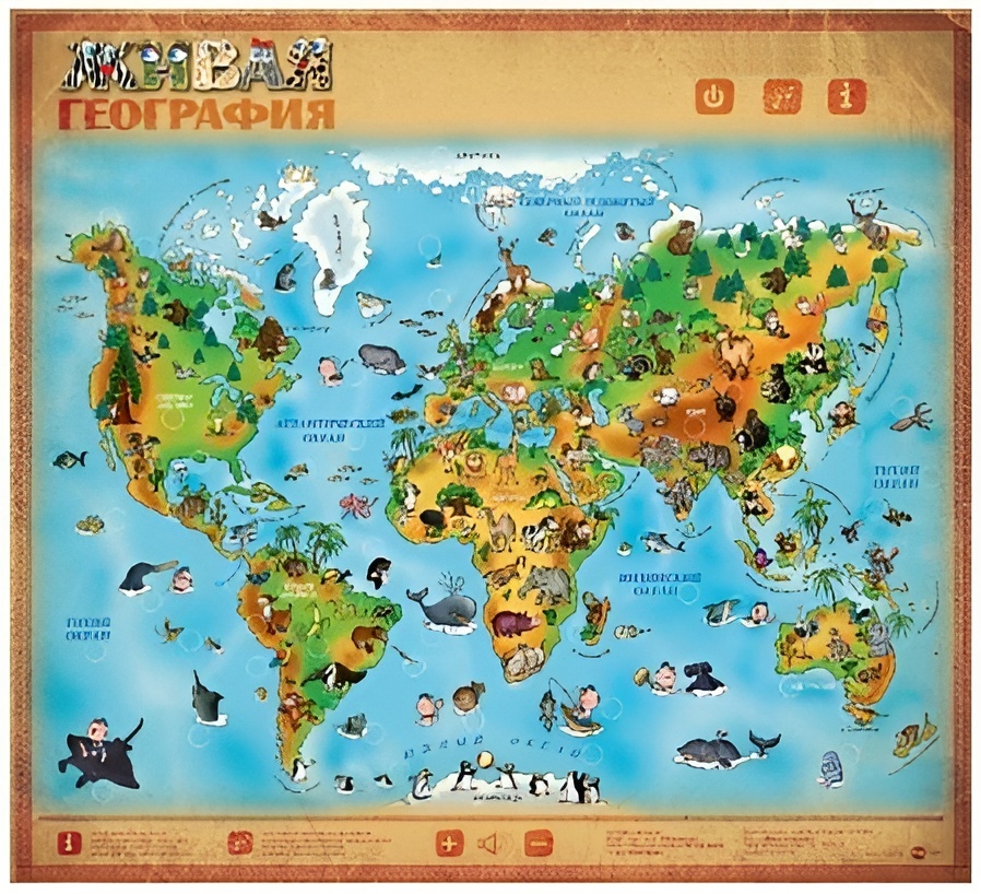 • ЗВУКИ: после включения этой кнопки, нажимая кнопки рядом с животными или географическими объектами, звучат названия и звуки, которые издают животные.