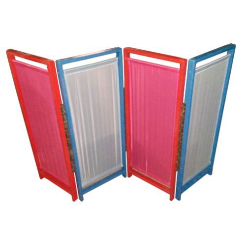 Ширма изготовлена из древесины березы и обтянута яркой тканью 2 цветов. Конструкция проста в обращении, легкая и занимает мало места.