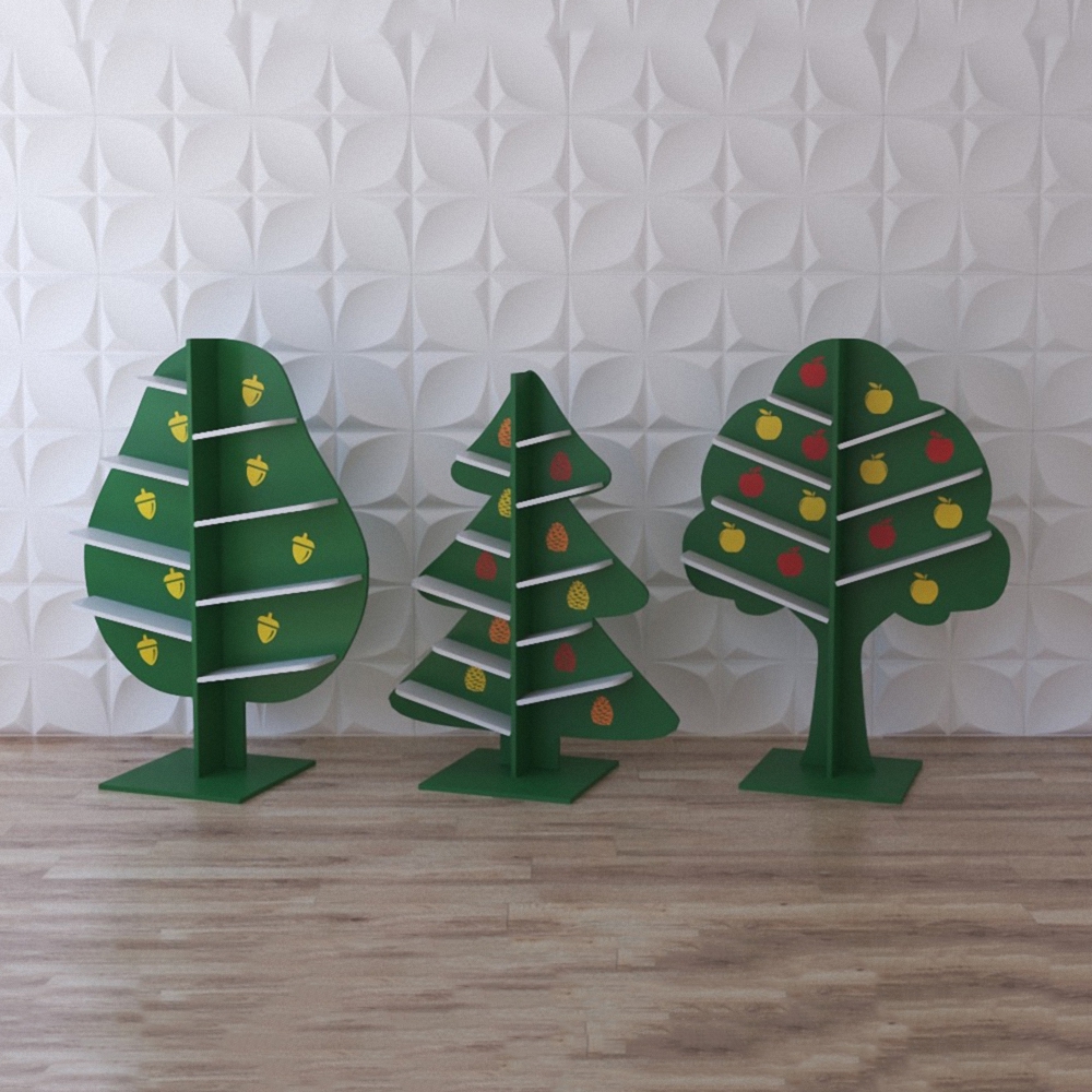 Набор экополок «Волшебный лес» представляет из себя набор модулей из натуральной древесины, в составе которого 3 полочки в форме деревцев – дубочек, ёлочка и яблоня; полочки окрашены в тёмно-зелёный цвет, а над олочками-веточками изображены жёлуди, яблочки и шишечки. Этот комплект может выступать в качестве игрового модуля для групп в садиках и яслях (для хранения игрушек).