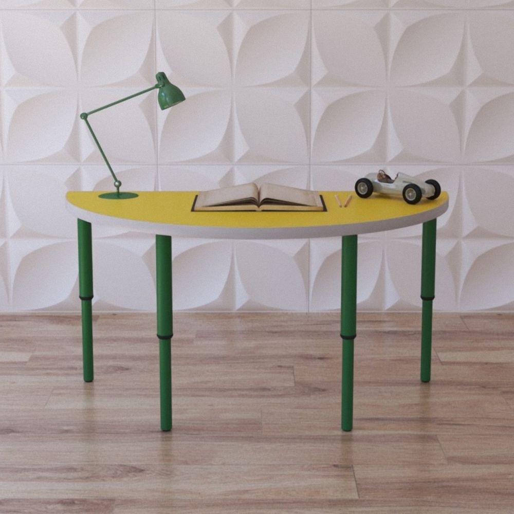 Двухместный стол состоит из полукруглой столешницы и четырёх телескопических ножек, благодаря им его можно отрегулировать на нужную высоту. Стол нужен для оснащения учебными местами начальных классов в школах, групп в ДОУ, коррекционных и развивающих центрах. Станет незаменимым предметом мебели для детей; за ним могут с комфортом разместиться 1-2 ребёнка.