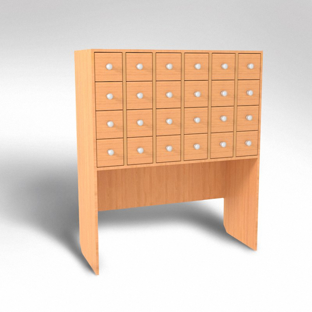 Шкаф имеет 24 выдвижных ящика, внутри которых установлена шпилька для крепления карточек.