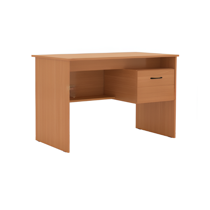 Габаритные размеры: 115*60*75 см, столешница, боковые панели, передний экран ДСП покрытие меламин, толщина 16 мм, цвет – ольха, клен, по краю столешницы и других частей стола – мебельная кромка ПВХ (столешница закромлена кромкой 1 мм, остальные детали кромкой 0,4 мм), наличие царги для усиления прочности конструкции, стол оборудован встроенной подвесной тумбой - 1 шт., с двумя выдвижными ящиками.