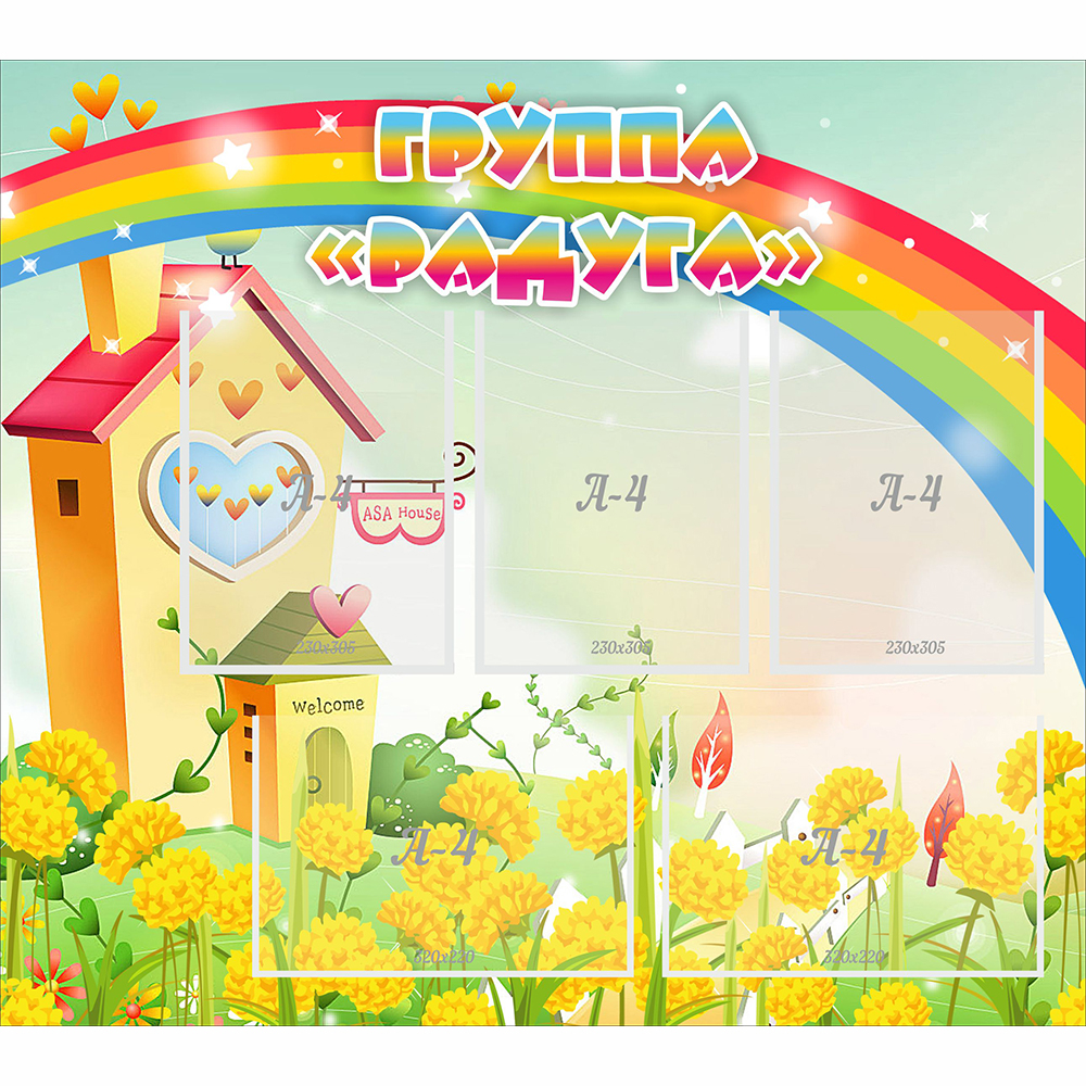 Дизайн стенда выполнен в спокойных желтых и розовых тонах: домик с сердечками, желтые цветы. И на этом фоне - ярчайшая радуга. Название стенда также раскрашено в цвета радуги с белой окантовкой, благодаря чему совершенно не теряется на её фоне.