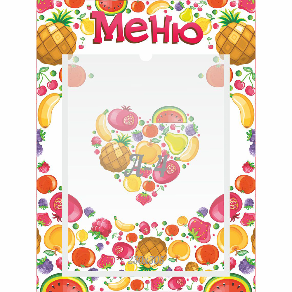 Яркий дизайн этого стенда привлечет внимание не только детей, но и их родителей. Основным элементом  является яркий калейдоскоп из самых разных фруктов и ягод. Название стенда написано большими малиновыми буквами на белом фоне. Родители издалека увидят меню.