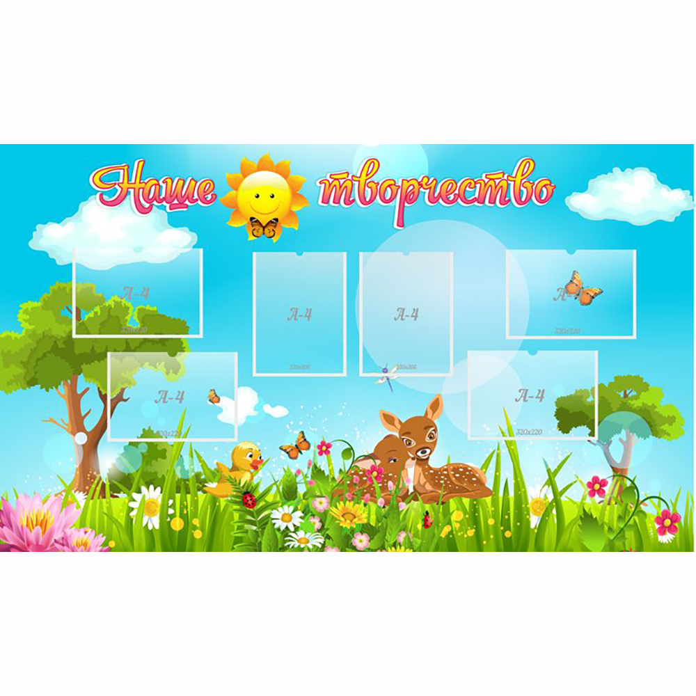 Для оформления стенда  использована картинка с изображением маленьких оленят на цветущей лесной поляне. Шесть вертикально и горизонтально ориентированных прозрачных карманов позволят разместить лучшие рисунки или аппликации юных художников.