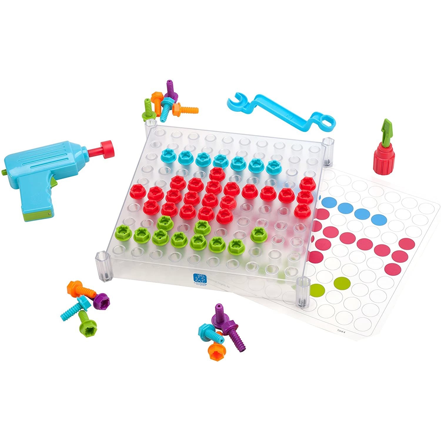 Абсолютная уникальность набора в прозрачной игровой панели! Подкладывая под панель карточки с шаблонами (входят в комплект), ребенку будет намного проще создать свои первые шедевры. Поняв принцип, малыш смелее будет экспериментировать над собственными картинами из цветных болтиков.