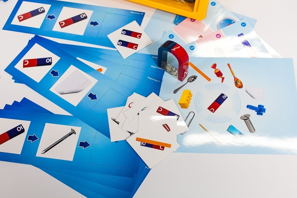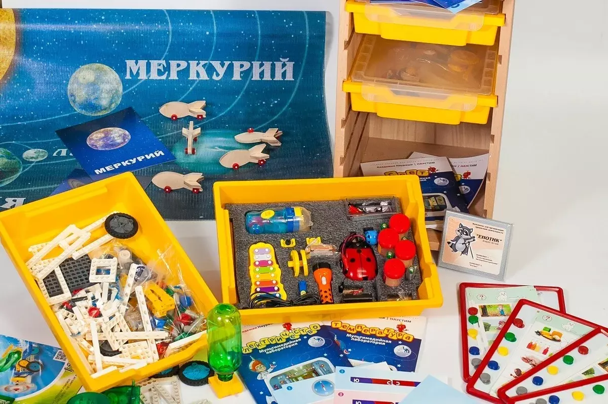 • Комплект № 1 «Естествознание. Экспериментирование». В комплект входят наглядно-дидактические материалы для индивидуальной и групповой работы с детьми дошкольного возраста: мультидатчик для изучения тем «Свет», «Температура», «Электричество», «Звук»; приложение для получения и обработки результатов с датчика, лабораторные приборы и оборудование для экспериментирования с магнитами, водой; «Обучающий планшет ДО», комплект карточек с заданиями по теме «Естествознание», видео-контент с обучающими роликами, журнал проекта.