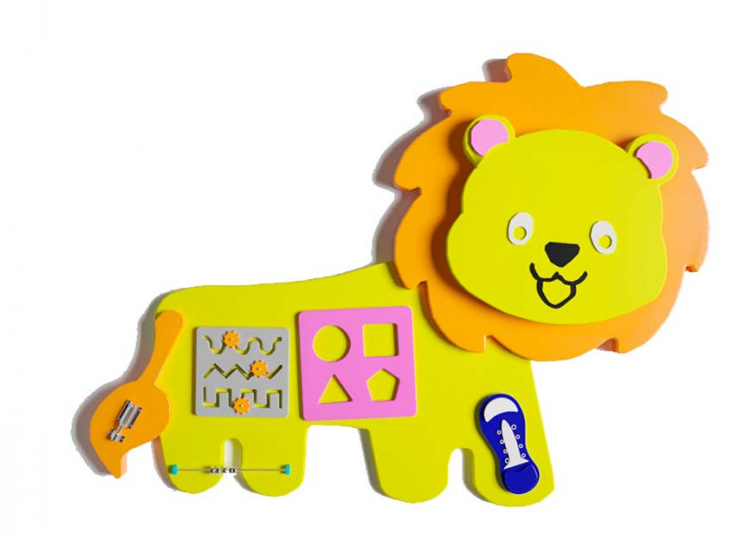 Настенный бизиборд, который будет интересен и увлекателен для детей разных возрастов. Его форма и изображение льва познакомят ребенка с миром животных, интересен будет и как герой из любимых мультиков. У доски нет острых углов, а поверхность не оставляет заусенцы. Бизиборд можно использовать для дома, для дошкольных учреждений, для медицинских клиник и для развлекательных центров.