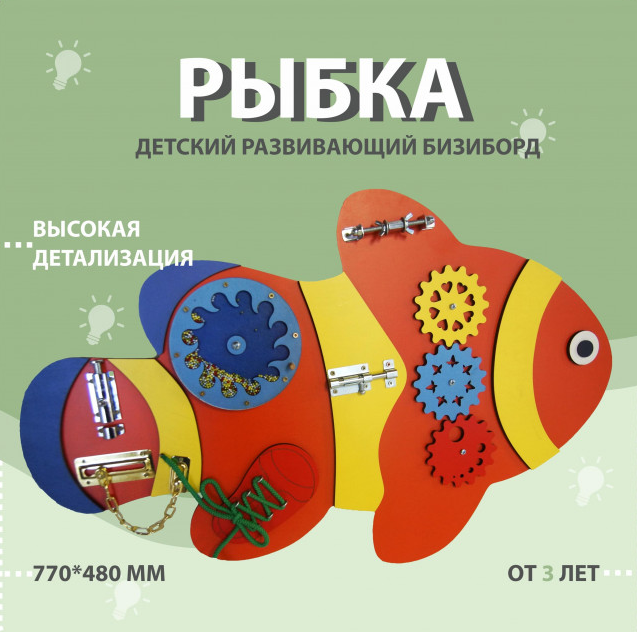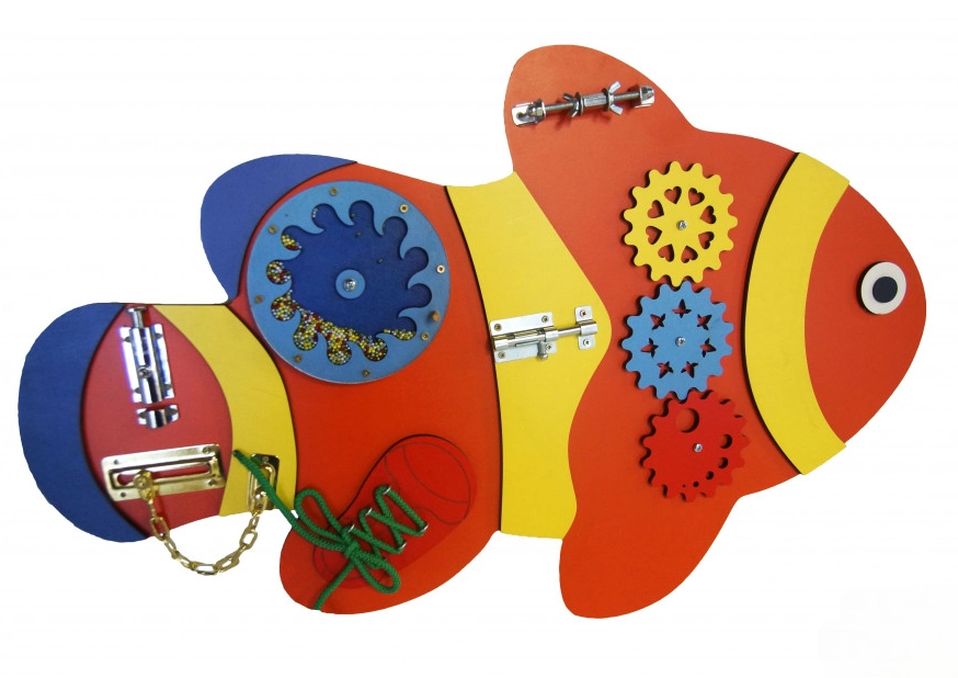 Многофункциональная доска для детей, которая будет интересна как малышам, так и детям постарше. Благодаря развивающей игрушке ребёнок быстрее познакомится и освоит мир вокруг себя. Форма и изображение рыбки познакомит малыша с подводным миром. Доска безопасна: не имеет острых углов и не оставляет заусенцы на коже малыша. Бизиборд можно использовать для дома, для детских центров, детских садов, для ресторанов и клиник.