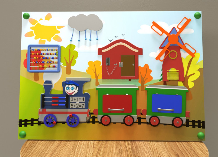 Настенная панель в виде вагончика — это необычный детский игровой модуль, ведь с его помощью можно не просто занять ребёнка, но сделать это с пользой для его развития. А ещё настенную панель представленной модели легко расположить в небольшом помещении благодаря компактному исполнению, что выгодно отличает её от объёмных аналогов. Поверхность обработана специальным образом и имеет многослойное покрытие из экологически безопасных материалов.