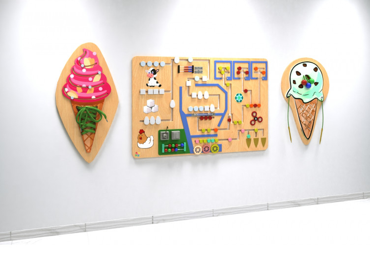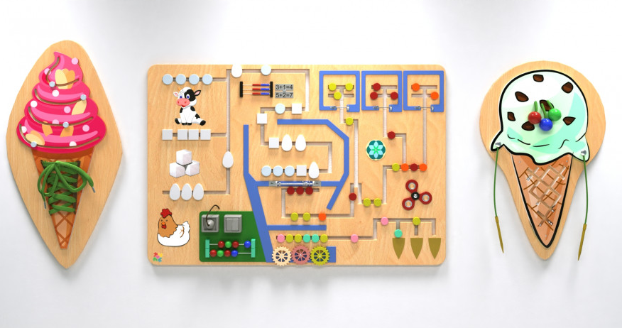 Комплект бизибордов на тему фабрики мороженого полностью соответствует своему названию – тут изображено настоящее фабричное производство мороженого со всеми его этапами, начиная от получения животной продукции (молока и яиц) для приготовления, и заканчивая аппетитными рожками прохладного лакомства (боковые бизиборды). Имеются и другие приспособления для развивающей детской игры.
