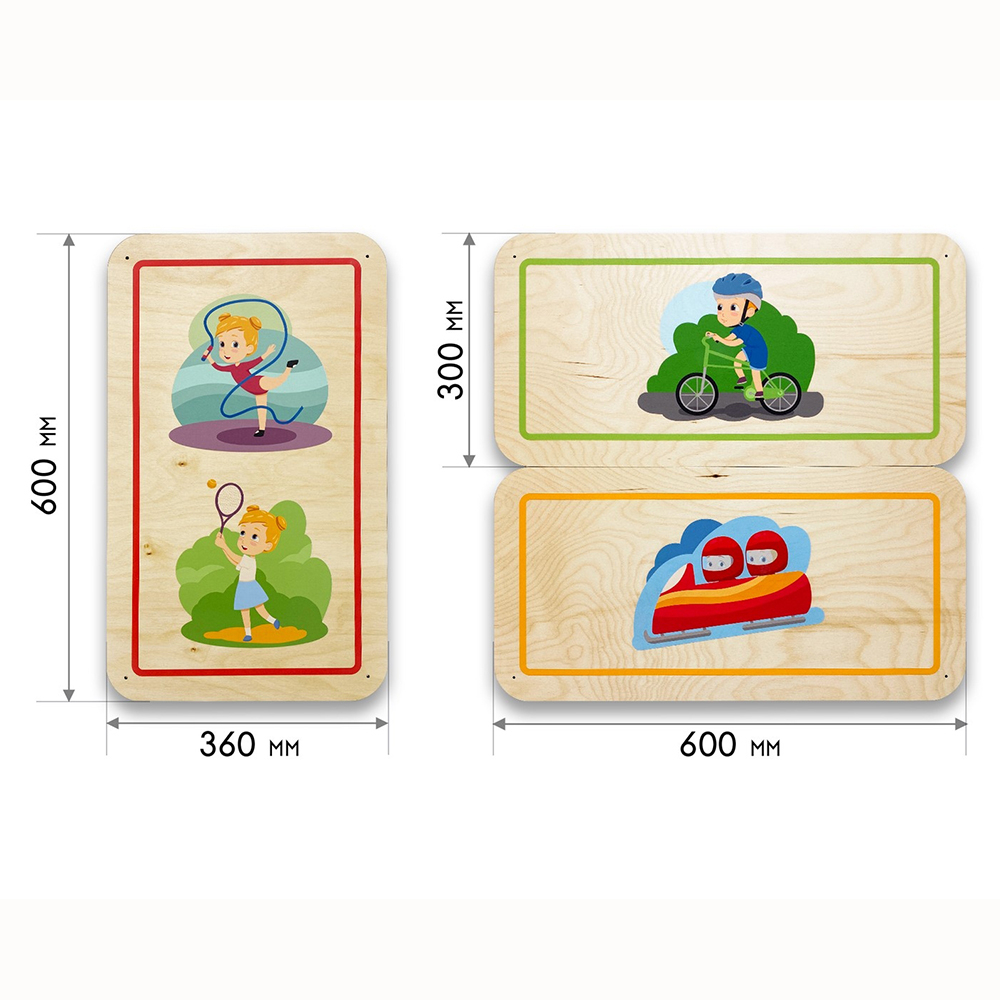 Дополнительные модули бывают однотонные и с тематическими иллюстрациями, подходящими под тематику дидактических панелей. Разнообразие размеров способствует декорированию стен различной конфигурации и масштабов. Параметры варьируются от совсем маленьких модулей 300х300 мм до крупных размеров 600х600 мм.