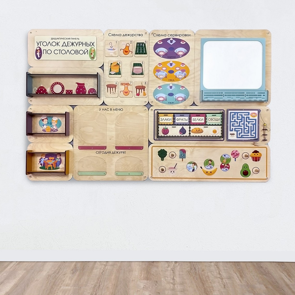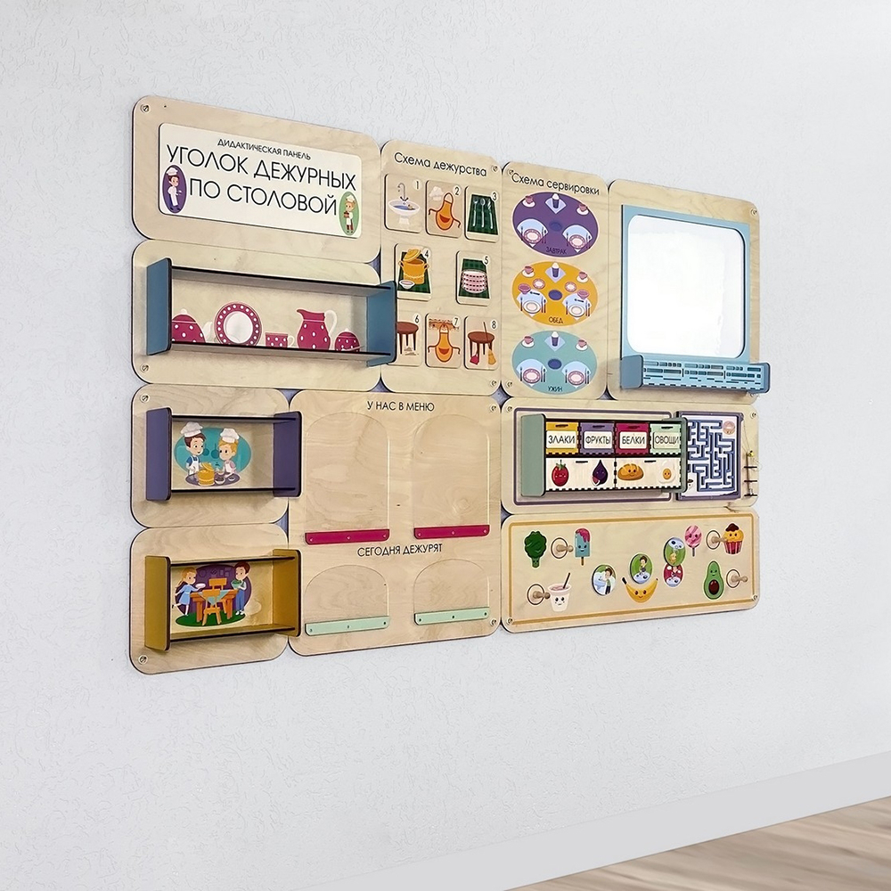 Главная Каталог Оборудование для детского сада Сенсомоторное развитие Сенсорные панели для детей «Уголок дежурных по столовой» - Дидактическая настенная панель