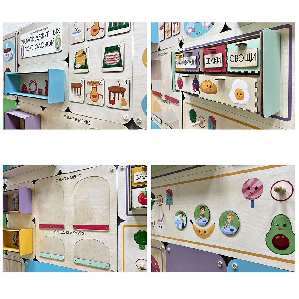 Дидактические панели отлично дополняю наборы цветных и иллюстрированных стеновых панелей, которые позволят оформить всё помещение в едином стиле.