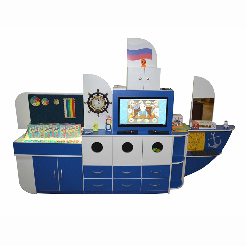 Конструкция корпуса и внешний дизайн комплекса повторяет геометрию морской шхуны, что позволяет быстро вовлечь ребенка в процесс обучения, а также проводить занятия по всем актуальным направлениям дошкольной и школьной образовательной программы. Наличие ящичков и полочек, существенно расширяет функциональность комплекса, превращая его в полезную и вместительную мебель, для хранения дидактических материалов, личных вещей детей или других предметов.
