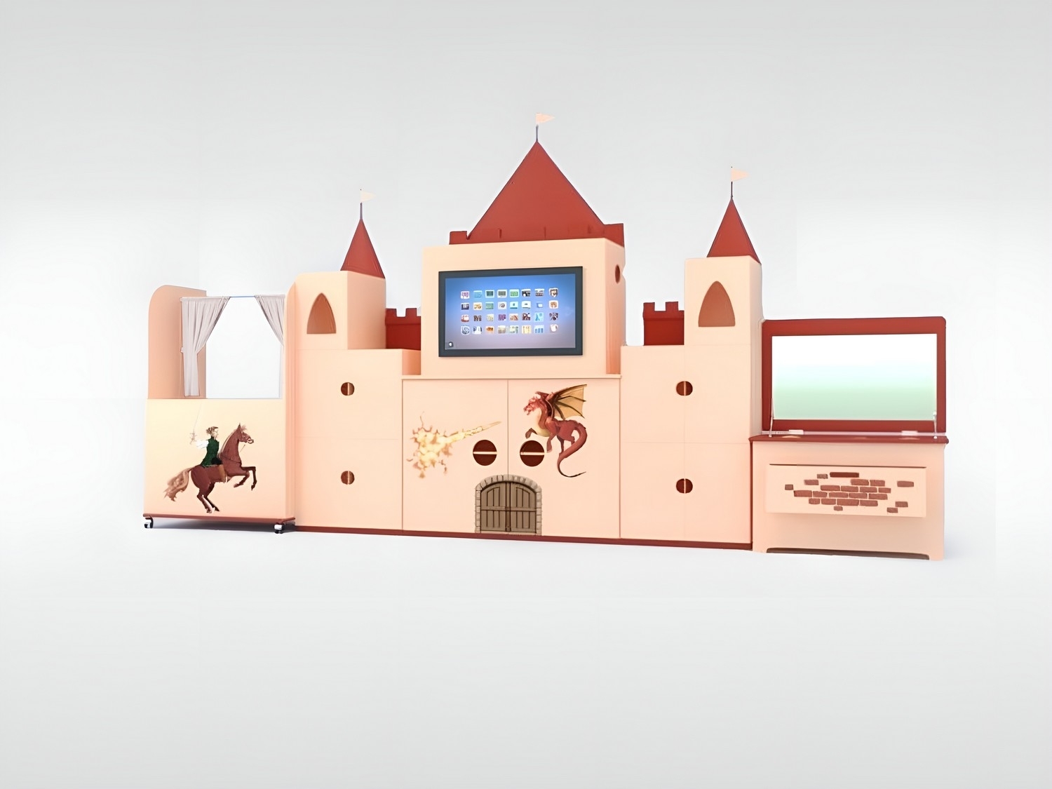 Продуманный до мелочей дизайн компактно вмещает в себя несколько игровых зон. На центральной части находится интерактивная панель со специализированным программным обеспечением. Удобные открытые книжные полки, скрытая от детского взгляда система хранения соответствуют всем требованиям ФГОС.