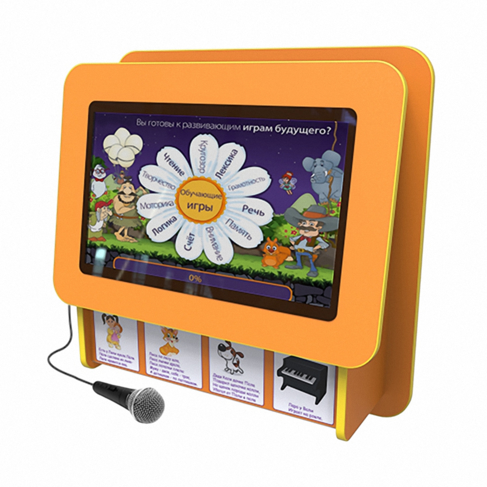 Интерактивное оборудование работает на базе компьютера с техническими характеристиками: процессор – Celeron, ОЗУ – 4Gb DDR4, Жесткий диск SSD – 120Gb, микрофон, акустическая система 2х3В, сенсорный дисплей 24 дюйма, 1920х1080 px с поддержкой до 10 одновременных касаний. Предусмотрена функция регулировки высоких и низких частот акустической системы, встроены разъемы HDMI и USB для подключения совместимого оборудования или установки нового ПО.