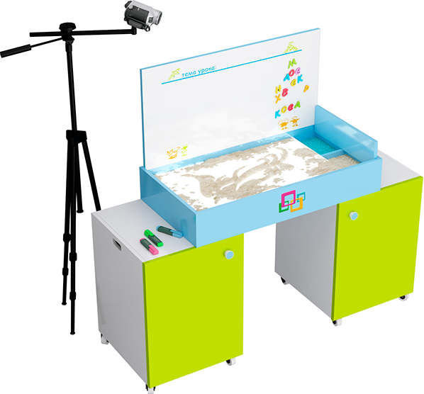 Стол воспитателя дополняет штатив с камерой, с помощью которых, изображение выводится на экран интерактивной доски или сенсорной панели. Таким образом, педагог наглядно и в реальном времени, показывает детям, что нужно делать.