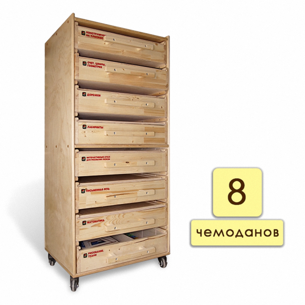 Чемоданы, доски и методрекомендации находятся внутри деревянного стеллажа, который легко перемещается в нужное место на небольших колесиках. Все компоненты без труда извлекаются из шкафчика, не застревая в пазах.