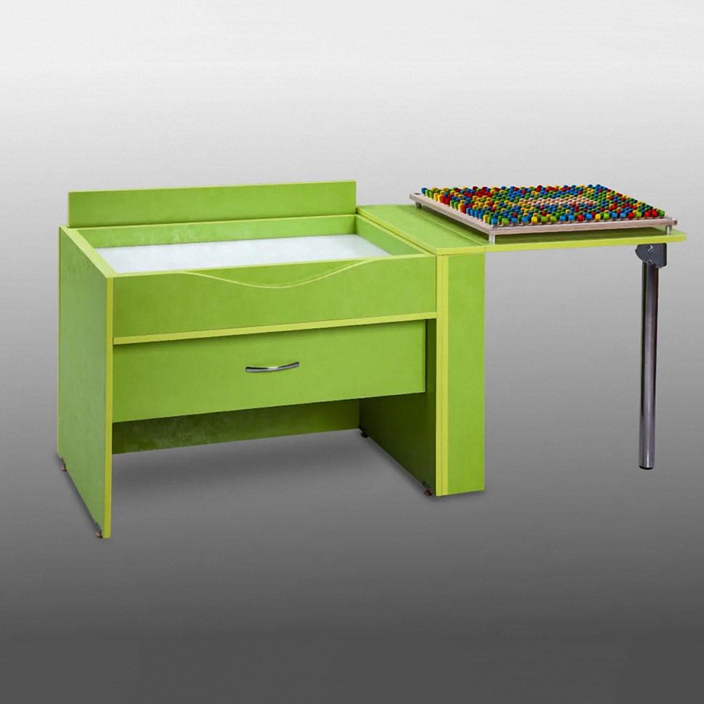 Стол состоит из нескольких элементов. Есть встроенный модуль для игры с песком, оборудованный подсветкой RGB. В него входит два вида песка – кварцевый и кинетический. Это помогает ребенку в полной мере проявить свою фантазию и развить творческие способности. Сбоку стола расположен откидной модуль с деревянной мозаикой. Она помогает развивать мелкую моторику, улучшает умственные способности и логическое мышление, повышает концентрацию внимания.