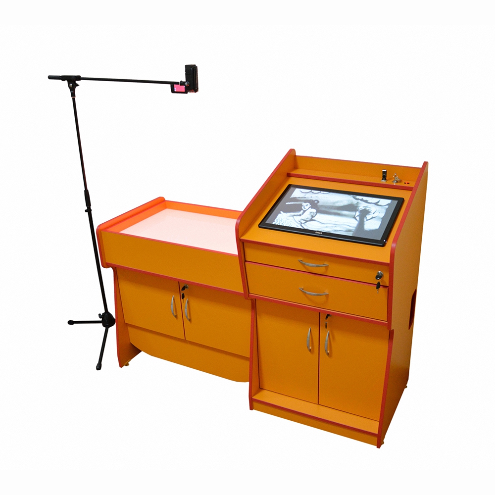 Преимуществом этого комплекса выступает вмонтированный в трибуну компьютер с веб камерой и сенсорным дисплеем, диагональю 21,5 дюйма - он поддерживает до 10 одновременных касаний. Камера с функцией ручной и автоматической фокусировки. Это помогает педагогу контролировать работу с ребенком.