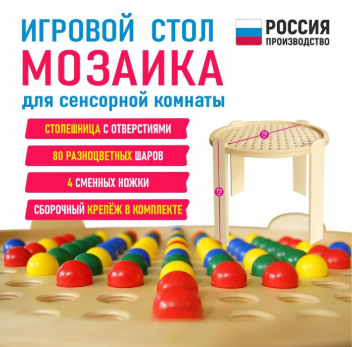 Игровой стол "Мозаика" - это любимая детская игра в мозаику в новом исполнении. Отдельный стол и разноцветные шары делают раскладывание по цветам более увлекательным.