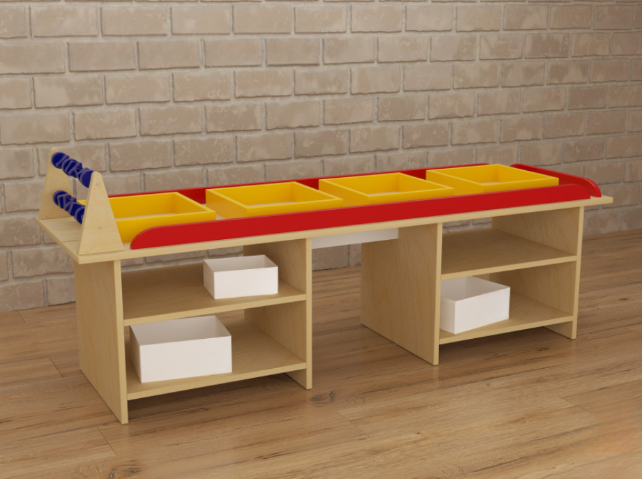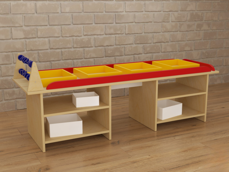 Игровой стол “Для сенсорных занятий” с полями станет незаменимым атрибутом для занятий в кабинете психолога, логопеда или дефектолога. За счёт яркого дизайна и разнообразного наполнения детский игровой стол можно считать необходимым элементом оснащения пространства для занятий с детьми – ведь ребёнку гораздо приятнее заниматься и играть за таким необычным и красивым столом. На столешнице имеются 4 зоны для сыпучего содержимого (песок, камешки, крупы и т.д.), по периметру дополнительно оснащена защитными полями. Внизу расположены 4 полки для контейнеров с развивающими играми и тактильным материалом. Для чего нужно: предназначен для групповых и индивидуальных занятий с детьми дошкольного и младшего школьного возраста в детских садах и центрах раннего развития, у частных специалистов.