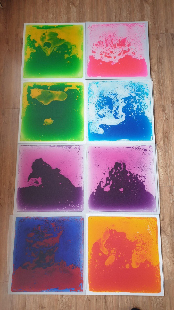 Внутри плитки находится жидкий разноцветный гель, который при надавливании перемещается как клякса и создает не повторимый рисунок. Плитка износоустойчивая, по ней можно ходить даже в обуви на каблуках. Покрытие плитки сохраняет комнатную температуру, имеет гладкую и не скользкую поверхность, материал плитки безвреден и безопасен. Укладывать можно на любую, твердую и ровную поверхность.