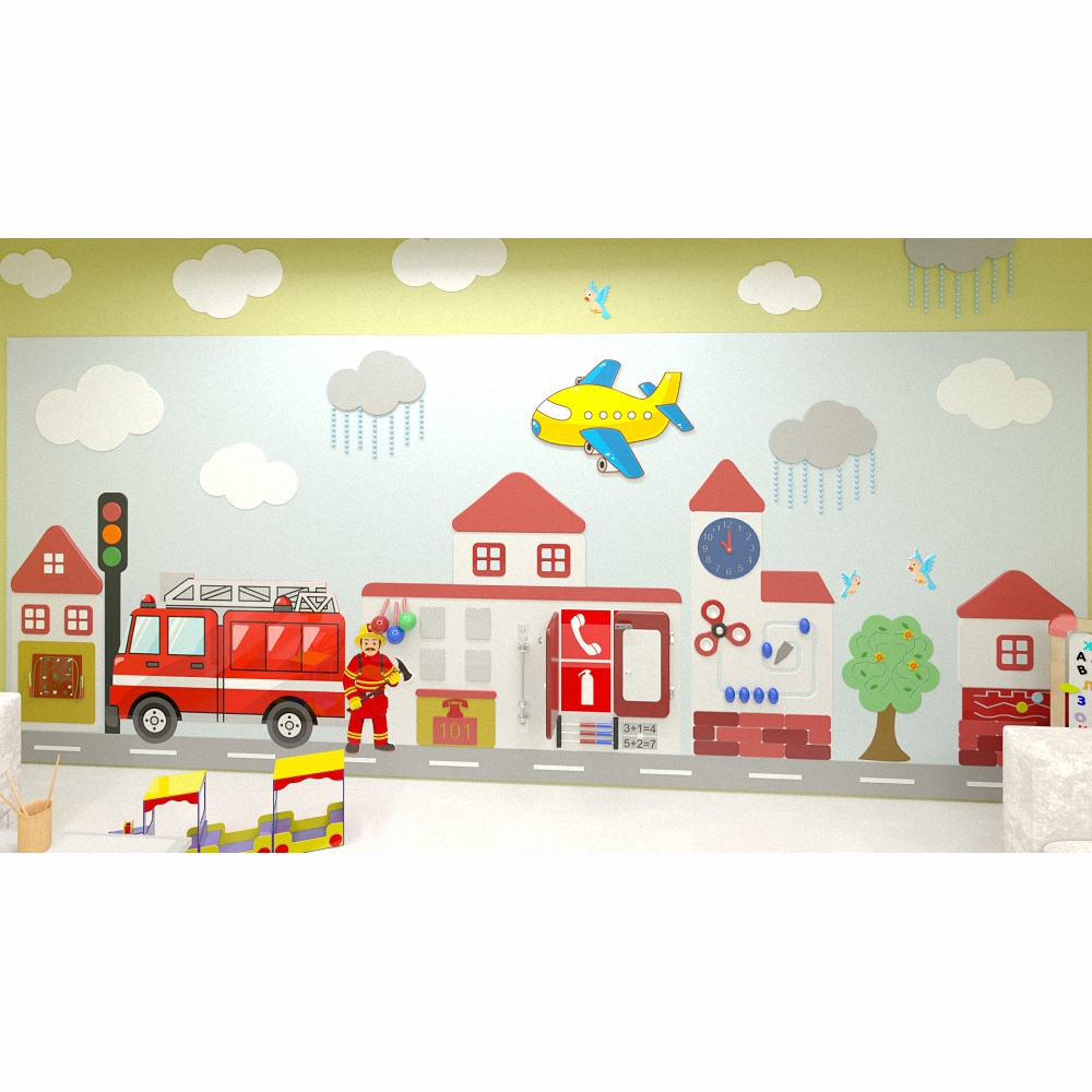 Настенная панель «Служба спасения» не нуждается в дополнениях и может выступать как самостоятельное оснащение игровой зоны в общественном учреждении (медицинской клинике, банке, кафе, частной компании) благодаря масштабным размерам и обилию разнообразных функций.