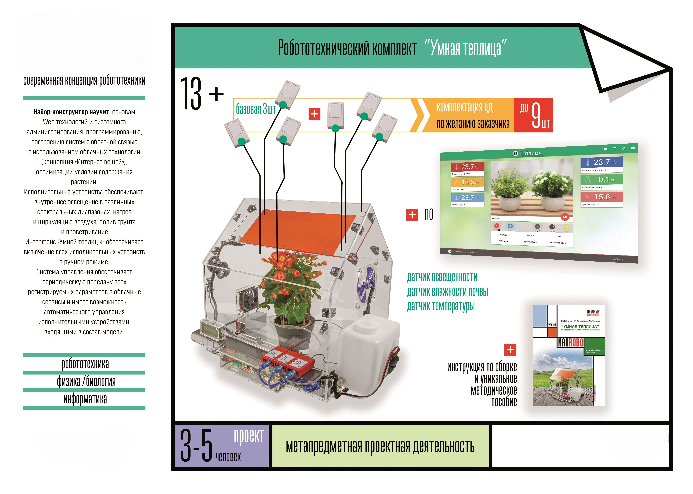 Робототехнический комплекс представляет собой набор-конструктор по сборке модели умной теплицы с роботизированной системой управления, объединяющий в себе следующие задачи: