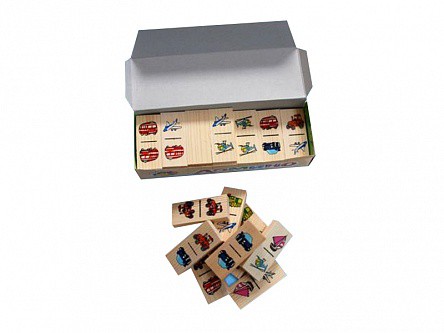Домино представляет собой настольную игру, состоящую в поочередном выставлении прямоугольных пластинок, разделенных на два поля с изображениями разных видов транспортных средств. Домино предназначено для ознакомления детей в возрасте от 3 до 6 лет с такими видами транспортных средств, как автомобиль, парусник, трактор, самолет, вертолет, автобус и паровоз, а также для развития логического мышления, сосредоточенности, внимания и мелкой моторики рук.