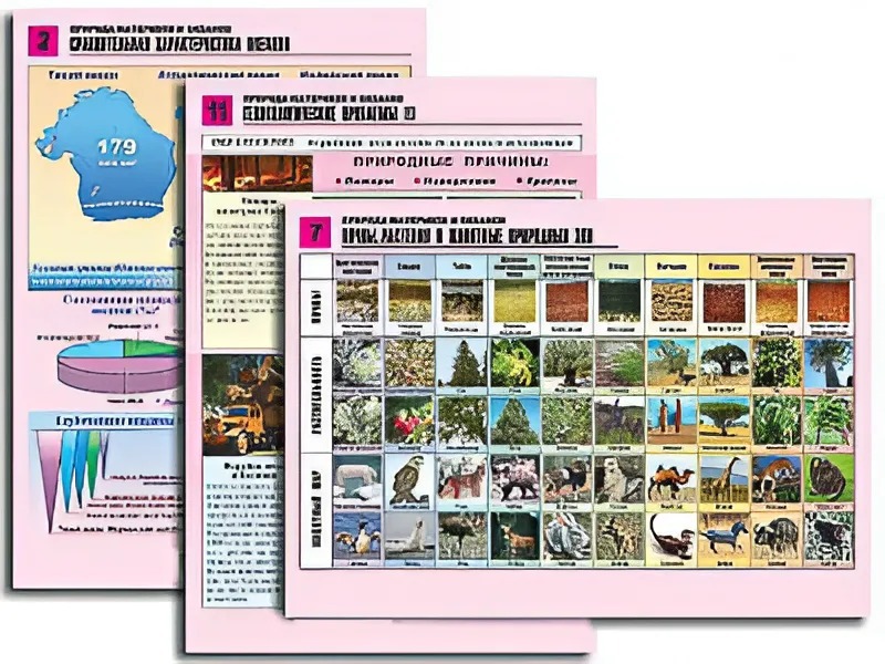 Комплект таблиц по географии "Природа материков и океанов" раздаточные (цветные, ламинированные, А4, 12 штук)