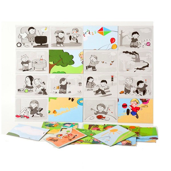 Возьмите магнитные карточки. Внимательно рассмотрите картинки на них. Заметили, что они все цветные, яркие? Это потому, что мальчики и девочки на них все делают правильно: ухаживают за деревьями, делают зарядку, вовремя ложатся спать, не размахивают вилкой за столом… Ваша задача – найти противоположные по значению пары, исходя из принципа: «это – плохо, а это – хорошо». Одной черно-белой картинке на поле должна соответствовать одна цветная картинка на карточке. Нашли? Положите цветную карточку на черно-белую картинку так, чтобы она примагнитилась.