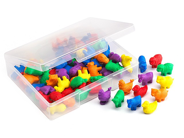 В наборе 72 фигурки домашних животных, 6 ярких цветов. Фигурки: курица, корова, утка, лошадь, свинья, баран. Все детали упакованы в контейнер.