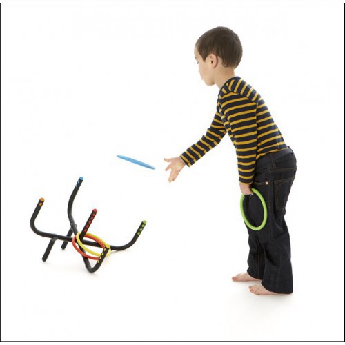 В комплекте имеется 5 колец различных цветов и две опоры, чтобы можно было расположить кольцеброс под углом, сделав игру проще для маленьких детей.