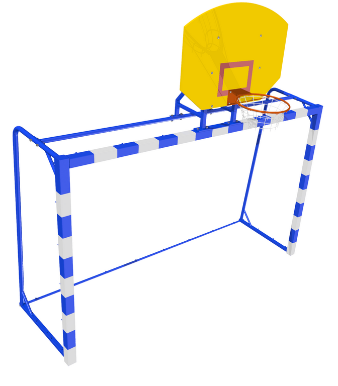 Прочная и практичная конструкция из ворот для минифутбола/гандбола в комплекте с баскетбольным щитом из фанеры позволяет экономить пространство спортплощадки. Конструкция разборная, благодаря чему удобна при транспортировке и монтаже.