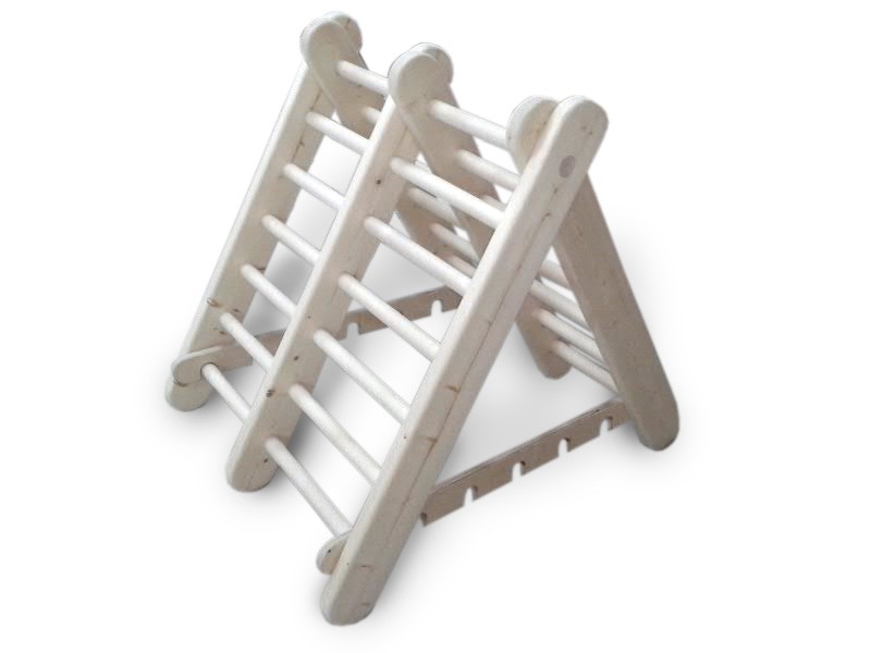 Детская лесенка стремянка изготовлена в классическом исполнении, в виде двух лесенок наклоненных друг другу под углом. Для предотвращения разъезда лестниц внизу стремянка соединена гребенкой. Также с помощью гребенки реглируется высота стремянки.